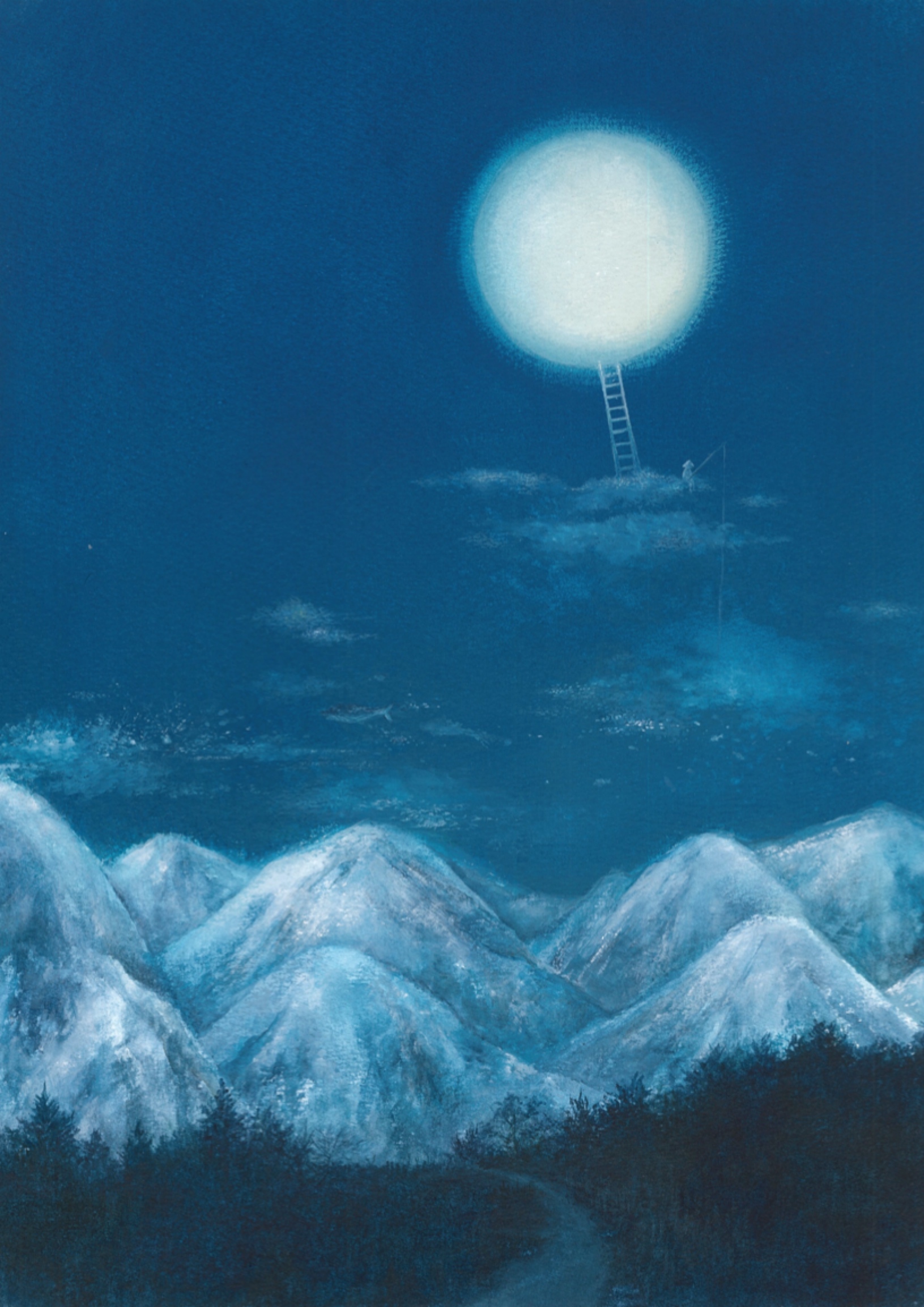 ハシゴがかかって、釣りをしてる何かがいて、雲間はうっすらクジラとか魚が泳いでる。